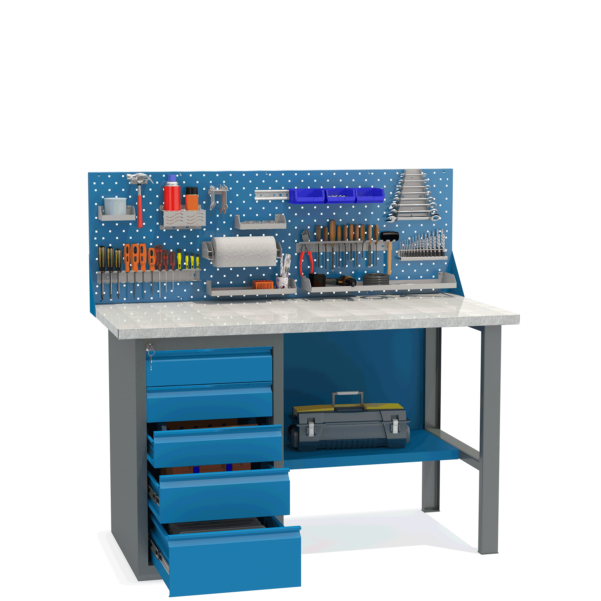 - Верстак укомплектован драйвером с пятью выдвижными ящиками разными по высоте и тумбой с полками.