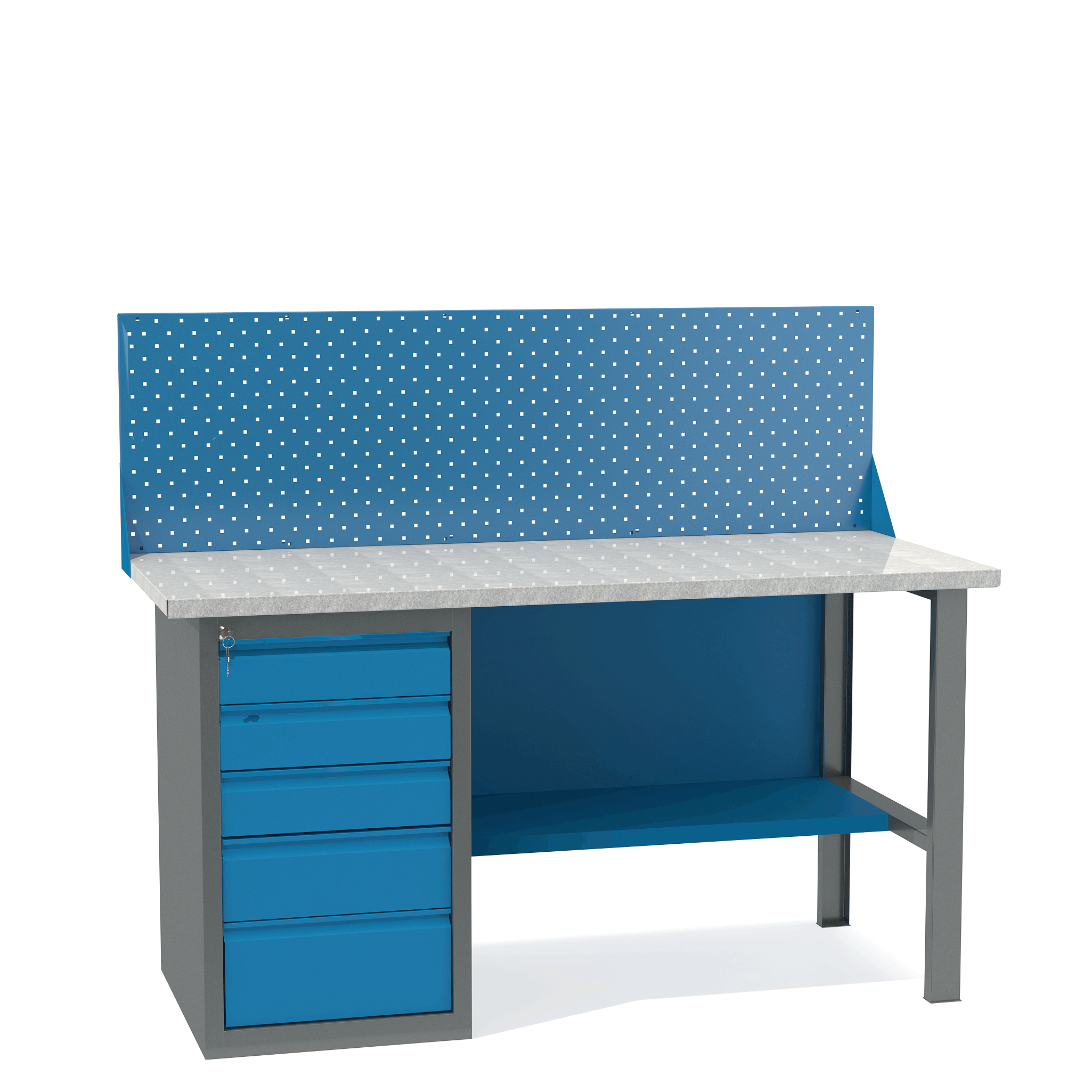 - Верстак укомплектован драйвером с пятью выдвижными ящиками разными по высоте и тумбой с полками.