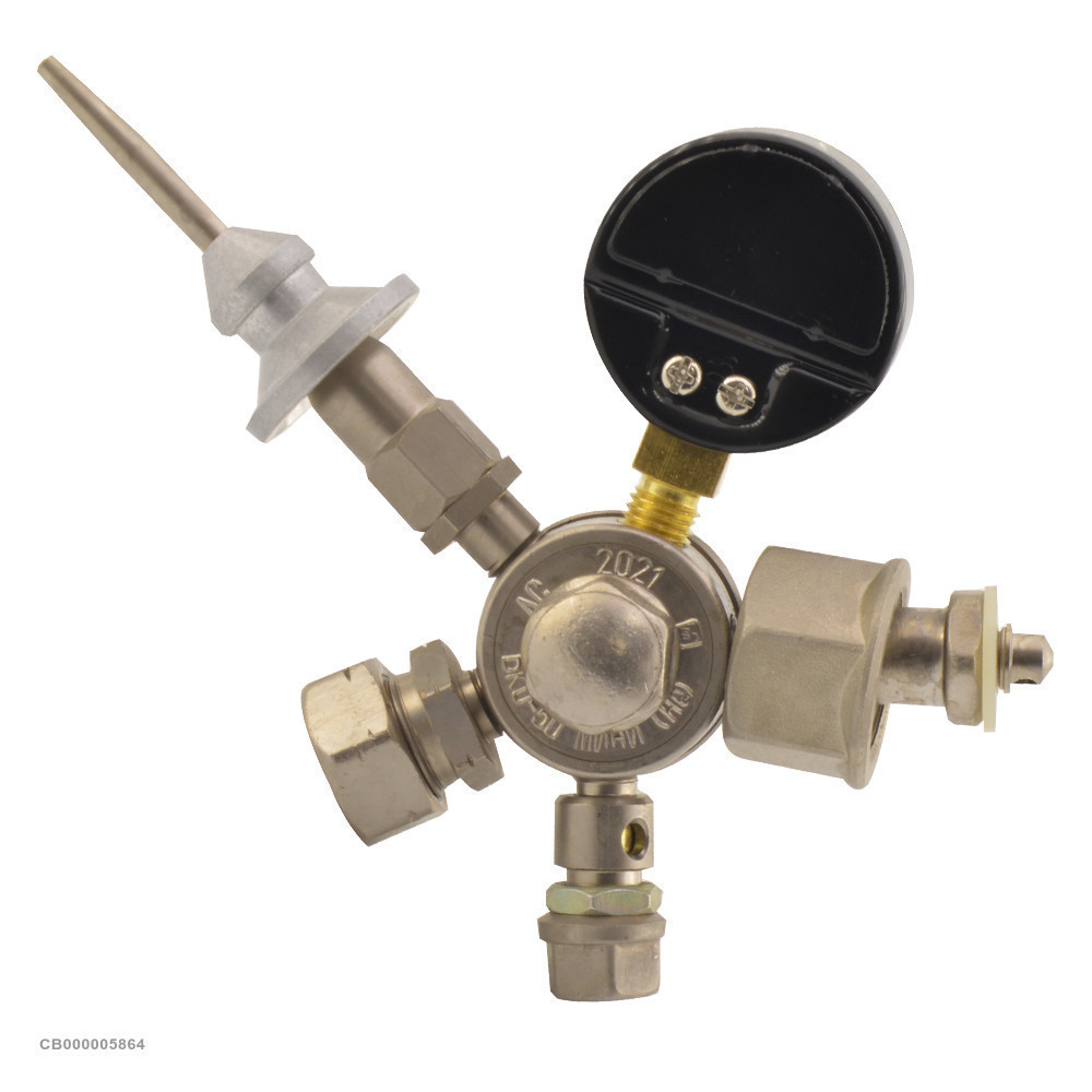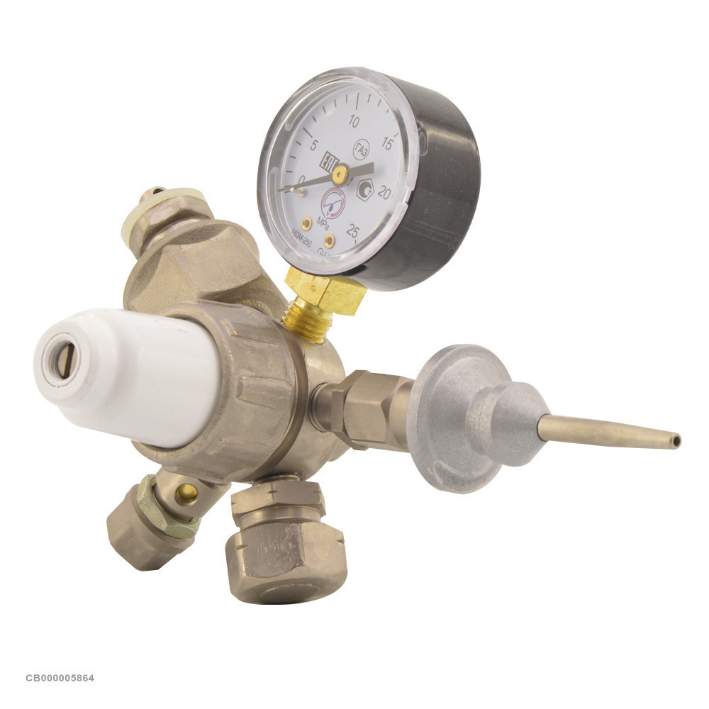 Редуктор БАМЗ для гелия имеет прочный корпус из латуни и оснащен манометром для контроля давления подаваемого газа.